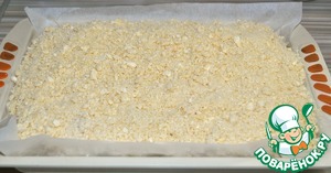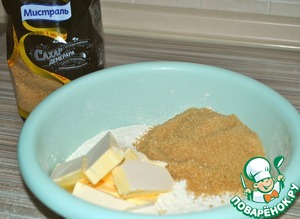 И готовим обсыпку. Для этого смешиваем муку, сахар, холодное сливочное масло. Рубим масло ножом на мелкие кусочка, затем растираем эту массу руками до образования крошек.