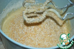 • 5) Добавляем кокосовую стружку обжаренную до золотистого цвета на сухой сковороде. Перемешиваем.