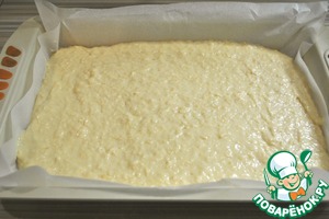 • 6) Тесто выливаем в форму 33 х 22,5 см. Накрываем пищевой пленкой смазанной с внутренней стороной растительным маслом. Маслом смазываем для того, чтобы пленка легко отошла от теста. И оставляем пирог до утра.
