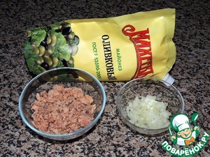 Рыбу размять вилкой и перемешать с мелко порезанным луком. Салат выложить порционно слоями с помощью сервировочного кольца: рис, лосось, апельсин. Каждый слой промазывать оливковым майонезом ТМ «Махеевъ».