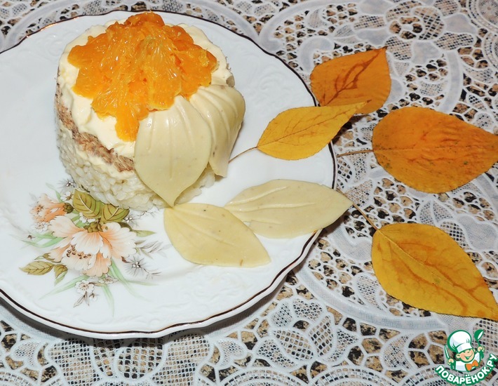 Салату дать настояться в холодильнике 30 минут. При подаче украсить "листьями" из плавленного сыра (их можно просто вырезать ножницами, прожилки сделать зубочисткой).