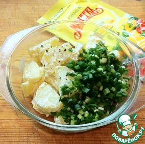 Смешать в миске ломтики картофеля с майонезом Махеевъ с лимонным соком. Посолить, поперчить, добавить зелёный лук.
