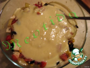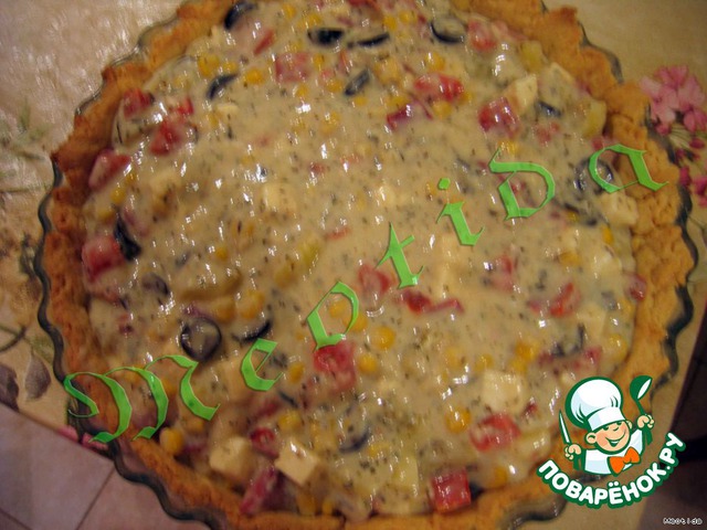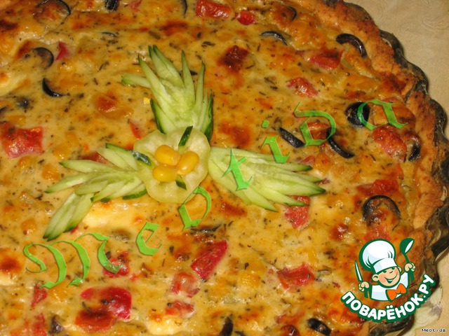 Нежная основа из теста с начинкой из помидора, перца, кукурузы, оливок и брынзы с ароматными специями в заливке из сыра, яйца, молока, муки и сливочного масла...