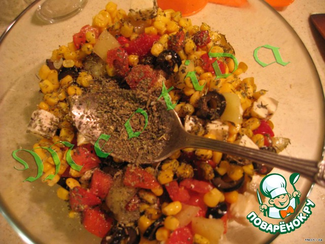 Помидоры, перец, брынзу нарезать кубиками (со стороной около 0,5см). оливки порезать тонкими кружочками. заправить все лимонным соком, оливковым маслом, перцем и солью и оставить минут на 20. через 20 минут все хорошо помешать, откинуть на дуршлаг, чтобы удалить лишнюю влагу. заправить овощи специями, молотым перцем, добавить кукурузу и хорошо перемешать