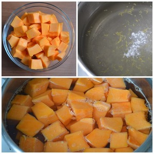 Мякоть тыквы нарезать кубиками. С лимона снять цедру и измельчить ее. В кастрюлю влить воду, добавить сахар, ванилин и цедру лимона. Довести до кипения и варить 5 мин. Добавить тыкву и снова довести до кипения. Уменьшить огонь и варить 7 мин.