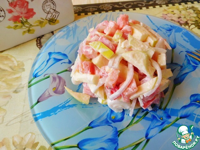 Лук порезать и если хотите убрать горечь, обдайте кипятком. Яблоко очистить от середки и порезать соломкой. Помидор нарезать не крупным кубиком.