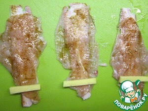 Раскладываем полоску грудинки, на нее пластик отбитого куриного филе и на один край, брусочек сыра.