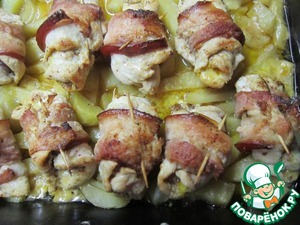 Очень сочные и нежные рулетики приготовлены из филе курицы, завернуты в пластик грудинки, и запечены на картофельном слое в сливочно-соевом соусе.