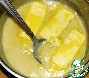 Пока выпекается кекс приготовим соус. Вскипятим сливки с сахаром и проварим 7-8 минут. Не забываем помешивать, чтобы не пригорели сливки. Отставляем и немного остужаем. Добавляем сливочное масло и перемешиваем до полного растворения и гладкости.