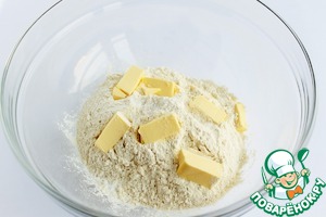 В чашу комбайна положите муку, соль, сахар, масло кусочками и перемешайте. Добавьте холодную воду и снова перемешайте. Можно замешивать тесто и вручную.
