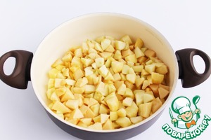 В большой сковороде растопите масло, добавьте яблоки порезанные на мелкие кусочки и тушите 5 минут.