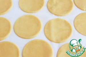 Разделите тесто пополам. Раскатайте скалкой круг. Из первой половины теста вырежьте круги.