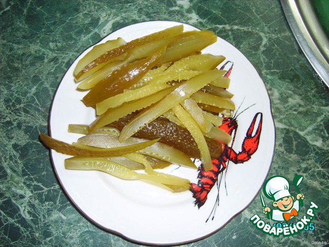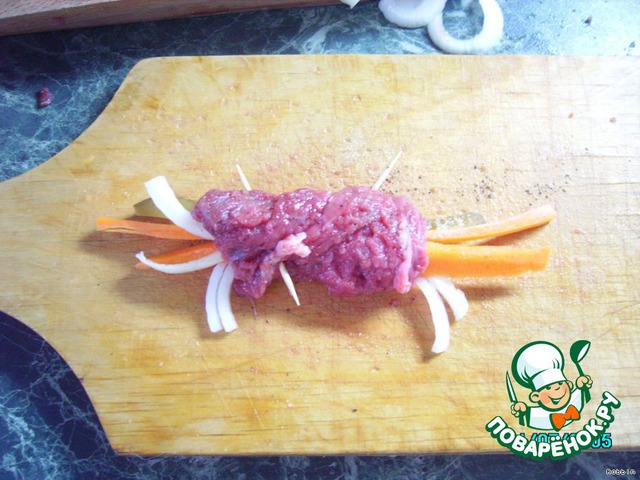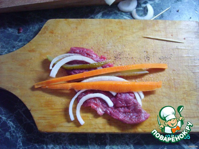 Кусок мяса посолить и поперчить с обеих сторон. Выложить лук, морковь и соленые огурцы по 3-4 брусочка.