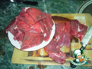 Нарезать говядину, желательно поперек волокон, кусками толщиной в 1 см.