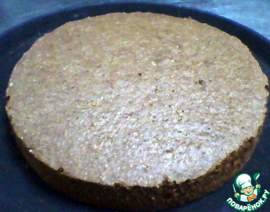 • Разрезать охлажденный бисквит на две лепешки. Промочить сиропом от груш, добавив Амаретто.