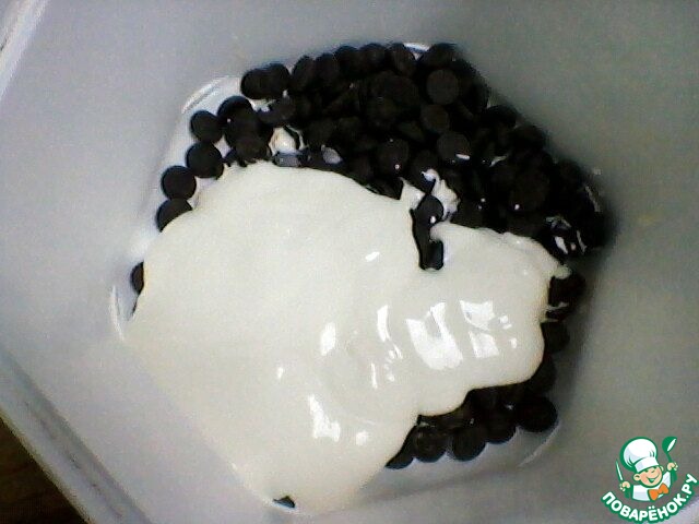 150 граммов сливок и шоколад растопить на водяной бане. Добавить предварительно замоченный и растопленный желатин.
