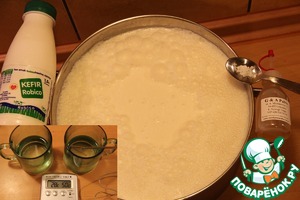 Добавляем сычужный фермент и кефир, разбавленные отдельно в воде (если решите сделать сыр с зеленью, сушёными помидорами или чем-то ещё, то добавляем именно на этом этапе), тщательно мешаем в течение одной минуты.