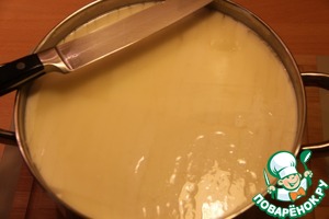 Режем его острым тонким ножом на квадратики 1-2 см и оставляем ещё примерно на 30 минут до полного отделения сыворотки.