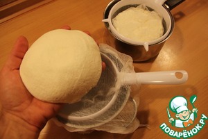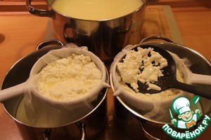 Откидываем получившийся сыр на сито, застеленное марлей. Сыворотку, конечно, не выливаем; я, например, использую её для приготовления домашней рикотты http://www.povarenok .ru/recipes/show/991 33/