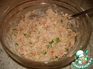 Смешать мясо тунца с фетой, творожным сыром, мелко нарезанными луком и отварной морковью, мукой. Если нужно, добавить соль и специи