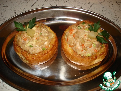 Наполнить булочки, бортики украсить майонезом. Запекать 10 минут при 180˚С