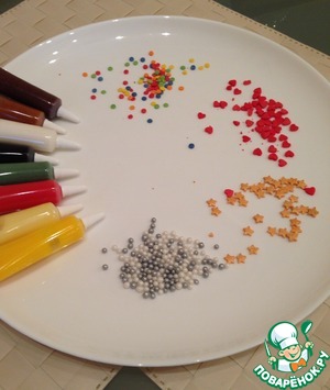 И теперь самое интересное - украшение. Я использовала сахарные карандаши и кондитерскую посыпку. Также здесь будет идеальна глазурь.