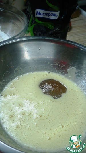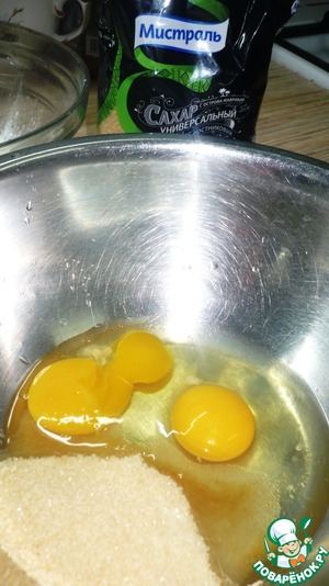 Яйца взбить с сахаром добела. Постепенно добавить масло.