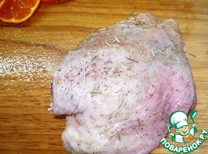 На каждый кусок утки положить веточку розмарина. У меня веточек не было, поэтому я присыпала иголочками розмарина.