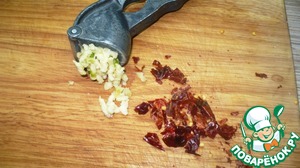 Чеснок почистить, выдавить с помощью пресса. Перец чили мелко порезать. Я использовала сухой чили.