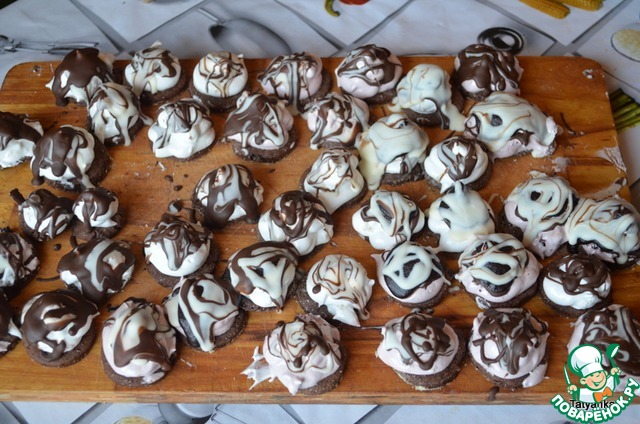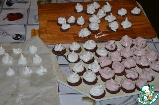 Из кондитерского мешка (или п/эт. пакета) выжимаем белковый крем (диаметр примерно 1см)на шоколадную основу. Ставим охладиться примерно на 10 мин. в холодильник (или на балкон, как я).