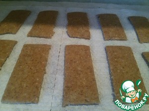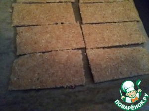 Разрезаем полученный пласт на равные прямоугольники. Включаем духовой шкаф на 180 градусов по Цельсию и ставим туда противень на самый верхний уровень на 30 минут.