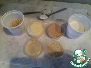 Подготавливаем ингредиенты в нужных пропорциях. Заливаем геркулесовые хлопья горячей водой. Пшенную и гречневую крупы измельчаем в кофемолке до состояния муки.