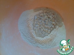 Высыпаем сухие ингредиенты в глубокую емкость. К замоченным геркулесовым хлопьям добавляем растительное масло, смешиваем. Делаем ямку в середине сухой смеси и добавляем полученную масляную смесь. Против часовой стрелки (для правши) смешиваем ингредиенты для образования теста.