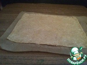 Берем пергаментную бумагу, на которой будем выпекать хлебцы и раскатываем на ней тесто в пласт 30х20 см в 3 мм высотой.