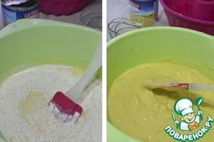 • В просеянную муку добавить разрыхлитель и перемешать. Добавить в наше тесто и хорошо перемешать.