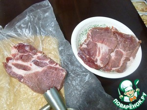 Мясо (лучше подмороженное) нарезать на кусочки примерно по 150 г. Дать разморозиться до конца и отбить через пленку или пакет.