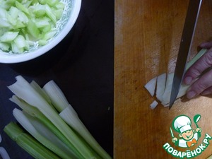Приступаем к приготовлению гарнира. Сельдерей нарезать по косой на кусочки длиной примерно в 1 см.
