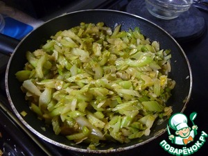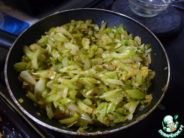 Два листа зеленой части лука-порея тонко нарезать, добавить к сельдерею. На сковороду с оставшимся разогретым растительным маслом выложить сельдерей и лук, посолить, поперчить. Жарить на среднем огне примерно 10-12 до тех пор, пока сельдерей не потеряет резкий вкус, станет мягким, но останется слегка хрустящим.