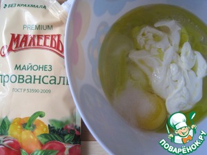 В отдельной посуде смешаем яйцо, майонез, уксус, соль, масло.