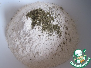 Муку смешаем с прованскими травами. Я на всякий случай начала замешивать тесто с 480 граммами муки, но в итоге мне понадобилось чуть больше муки, чем заявлено в рецепте. В общей сложности я использовала 550 грамм муки+ горстка на подпыл.