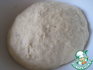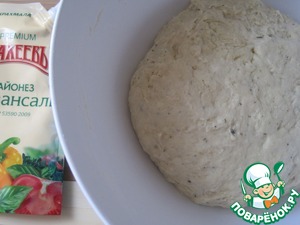 В муке делаем лунку, вливаем в неё майонезную и дрожжевую смеси. Замешиваем мягкое, немного липкое тесто. Накрываем и оставляем на 30-40 минут в тёплом месте (или до увеличения в объёме в два раза)
