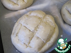 Я сформовала круглые булочки, сделала надрезы, имитируя черепаший панцирь, переложила булочки на противень, укрыла и поставила на расстойку. Уже через 10-ть минут мои красивые нарезы превратились в нечто страшное. Думала-гадала, как же сделать аккуратно.. И придумала.. Заново сформовала булочки и острым носиком ножа сделала не нарезы, а скорее "наколки". Просто обозначила будущую сеточку-панцирь. И так, укрываем и оставляем для расстойки на 20-ть минут (или до увеличения в объёме). А пока включаем духовку на разогрев t 210 градусов.