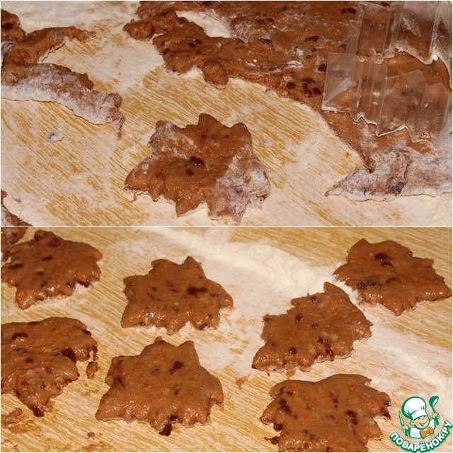Приготовить из полученной массы тесто, подсыпая постепенно муки (до 4 стак., но не больше). Тесто должно не только держать форму, но и вырезаться формочками (если это необходимо).