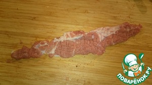 Свинину нарезаем на продолговатые полоски, примерно 12 см на 3 см, отбиваем, солим, перчим