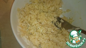 Отвариваем рис до готовности, даем остыть. Добавляем яйцо, солим перчим. Перемешиваем.