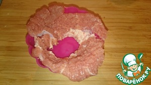 Закрываем верх краями, если не хватает краев, отбиваем еще небольшой кусочек мяса, закрываем начинку. Выпекаем в духовке при температуре 190 С, последние 5 минут в режиме "гриль"