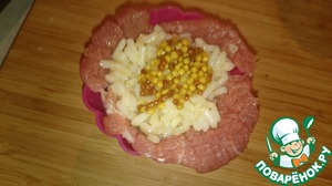 В силиконовые формочки для кексов выкладываем полоски мяса, как на фото