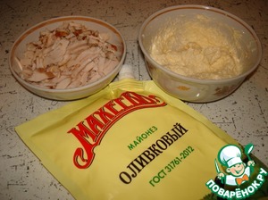 Порезать копчёную грудку мелкой соломкой. Сыр натереть, смешать с маслом, майонезом и щепоткой паприки.