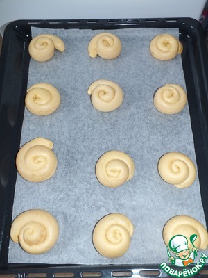 Затем свернуть в улитку. Улиточки выкладываем на противень застеленный пекарской бумагой и даем время на расстойку