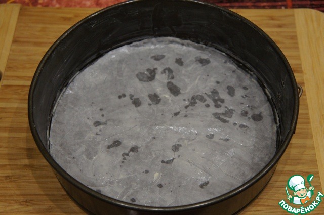 Форму d 23 см застелить пекарской бумагой, смазать маслом бумагу и борта.